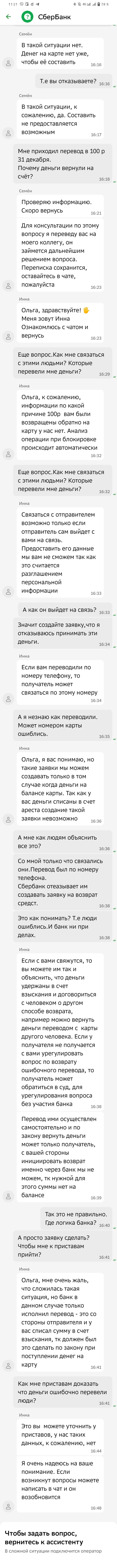 Но итог один. Деньги в блокировке. Заявки Сбербанк не принимает ни с какой стороны. Говорит,что денег нет на счету,значит нельзя вернуть. Банк предложил мне прийти в отделение банка и по номеру счета отправить этим людям деньги.Либо решать о возврате средств через пристава.