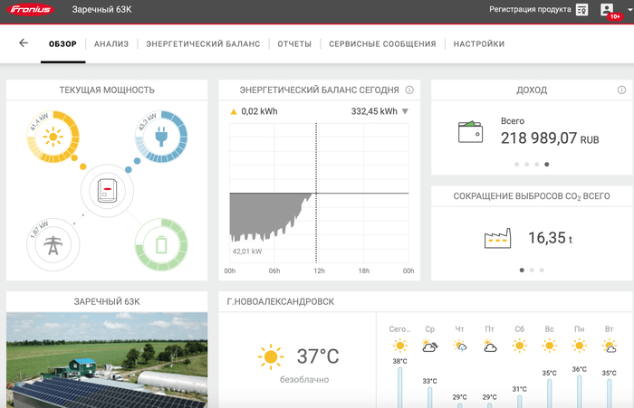Скриншот из системы мониторинга СЭС с форелевого хозяйства. Показан пример онлайн работы станции, когда генерация солнца на 99% перекрыла потребление объекта.