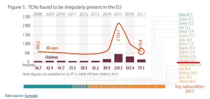 Европейский парламент опубликовал очередной отчет о проблемах с незаконными мигрантами (http://www.europarl.europa.eu/RegData/etudes/BRIE/2019/63790... в приведенной официальной статистике сообщается, что в 2017 г. больше всего незаконных мигрантов было выявлено из Албании, Сирии, Марокко, Ирака, Афганистана и Украины. Свободная европейская страна обогнала по данным ЕС Пакистан, Алжир, Нигерию и прочие страны.