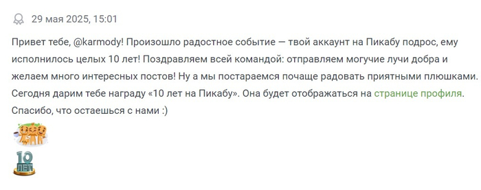 "10 лет я уже здесь. И народ еще не отписался. Вместе мы – часть системы! Останусь-ка еще на десятку!"