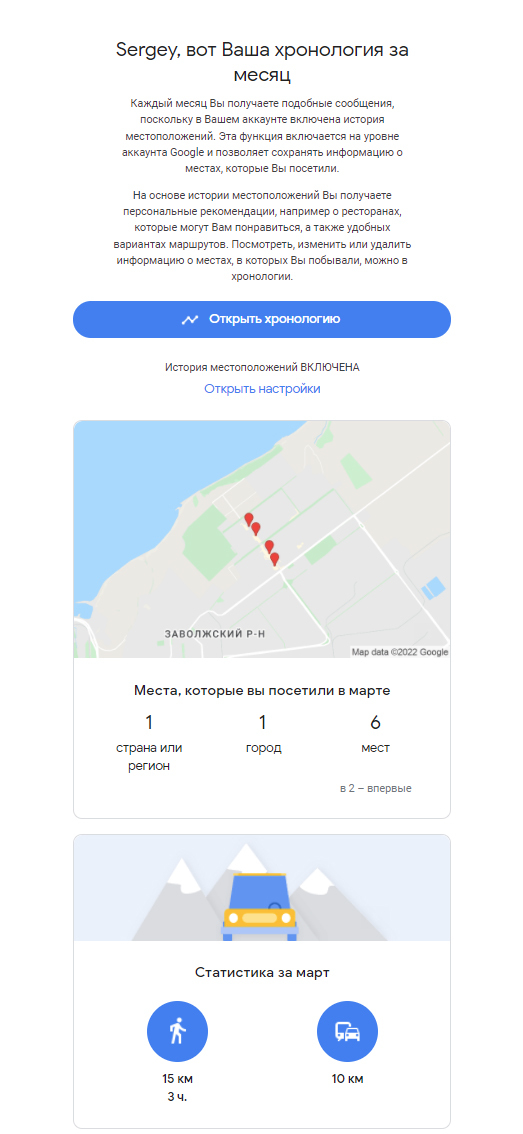 Случайно зашел на почту и наткнулся на интересную статистику. Оказывается за Март я прошагал всего 15 км и посетил всего 6 мест, 2 из которых новых. Подозреваю что это был новый пункт выдачи wildberies в соседнем доме, а второе Ozon, в том же доме. Хз откуда там еще транспорт нарисовался, тк давным давно уже никуда не ездил