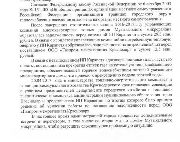 На данный момент ситуация такая: люди поставили бойлеры, так как УК говорят, что воды до октября не будет, ибо суды начнутся только в июле. Из-за бойлеров постоянно вырубается электричество. Это ещё сплиты пока не работают. Есть опасения, что летом мы будем сидеть без электричества, горячей воды и при жаре в +40, это всё-таки Краснодар.