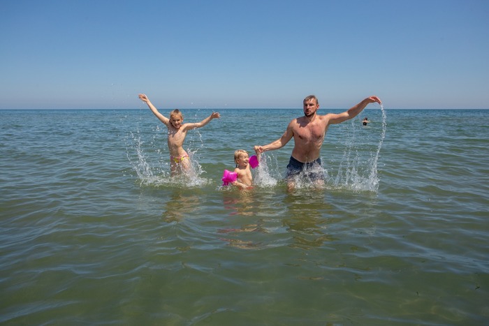 Река глубокая и детям следует надевать нарукавники/круги/жилеты, есть течение, что создаёт дополнительную опасность. Мы надели детям нарукавники и они были готовы не вылезать из воды целый день.