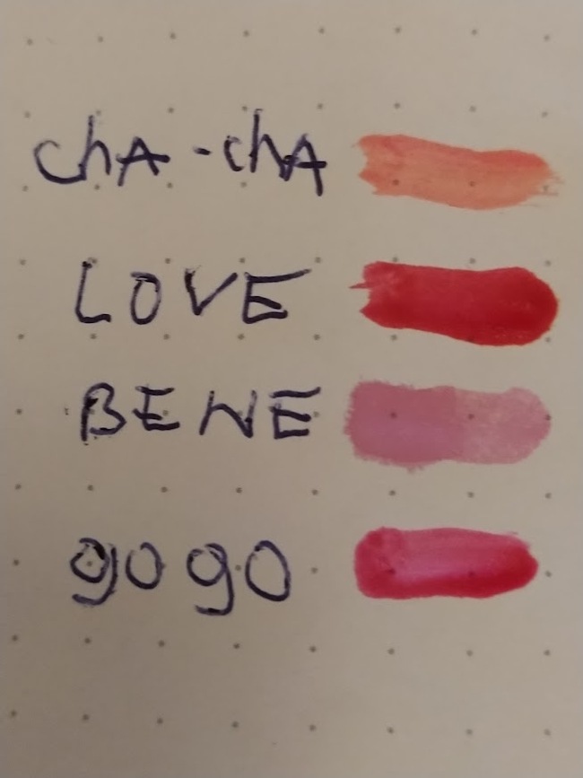 Радостные тинты - не особо мной почитаемый продукт, но они многими любимы. У кого полные губки, то это занятная альтернатива помаде и они не оставляют следов: на бокалах, одеждах и чужих щеках. У кого губки тонкие, то эта тема их не полнит и не увлажняет, такое себе развлечение. Но на щечках это более интересно у всех и хорошо заменяет румяна. У меня их набор из 4 штук. Самый хороший из них бордово - прозрачный с запахом роз (отдушка супер). Для людей с бледной кожей с ним получается эффект «белоснежки» с нежным румянцем c мороза. К сожалению, не могу сказать, что обновлять сие чудо в течение дня не надо, иногда вместо милоты, губы кажутся, по прошествии, странно треснутыми и это эффект на любителя. Bene, Go-go, Love, Cha-cha - название тинтов. Все кроме винного, плотные. Цвета: малиновый, бордовый, красный, персик. На подарки - все это блеск.