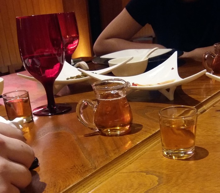Время почти 17:00, на автобус мы не успевали (спойлер, мы так и не знаем как он выглядит). Решили пойти все в один номер потягивать ликер и поразмыслить, где пожрать. Во время очень буйных рассуждений, мы все просто уснули на 2х одноместных кроватях. Проснулись с желанием жрать, маленькие китайцы выглядели аппетитно. Время 19:а черт его знает. Паника. Смуты в семье. Решили гулять по отелю в поисках еды. После 7ми вечера темнеет почти моментально. Нашли ресторан при отеле, красиво, китайский лофт Инь-Янь. По-русски никто не говорит, к счастью говорит персонал на английском. Долго выбирали. Навыбирали суп из морепродуктов (скорее бульон с морепродуктом) ценой по 158 юаней х 4. Мама очень хотела утку по-пекински, на столе она оказалась тоже "всего" за 270 юаней. Хотели гарнир, спросил про рис, официантка уточнила какой и рассказала какие есть rice duck звучал ой как интригующе и как выяснилось из счета стоил всего 50 юаней за большую порцию (вдвоем точно можно было наесться). Что пить? Решили продолжить пить теперь уже местную чудо бухло. Вино... Вино рисовое белое за 398 юаней. Несовершеннолетней сестрёнке коконат минт милк. Все быстро принесли, все вкусно. Утка, хлебные лавашики для нее, заедаем рисом с уткой. Прикольнула традиция распития вина (сказали 15° пойло, по вкусовым ощущениям соврали, казалось за 30, одному мао дзе дуну известно)