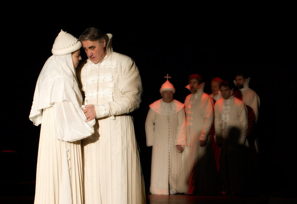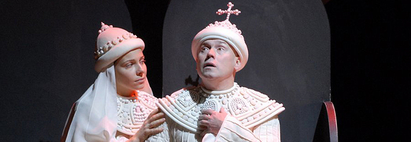 Как вы можете видеть по фотографиям, в спектакле многое построено на цвете одежд и свете. Одежды разделяют пьесы. Времена Ивана - в чёрном, времена Федора - в белом. Но, всё не так однозначно. Свет же подчёркивает многие сцены. Я завидую аппаратуре Моссовета