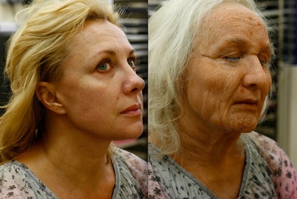 Поверхностный старческий грим. Грим, который выглядит не очень естественно, но наносится очень тонко, дабы не смазать мимику. Выглядит, конечно слабовато, но в целом вполне прилично.