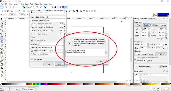 Проблемы начались в проге отрисовки чертежей Inkscape при настройке (по видео скинутого продавцом) она упорно выдавала такие ошибки и неважно какой бубен я брал в руки для запуска. 1-я ошибка при базовой настройке, 2-я при выгрузке в G-CODE.