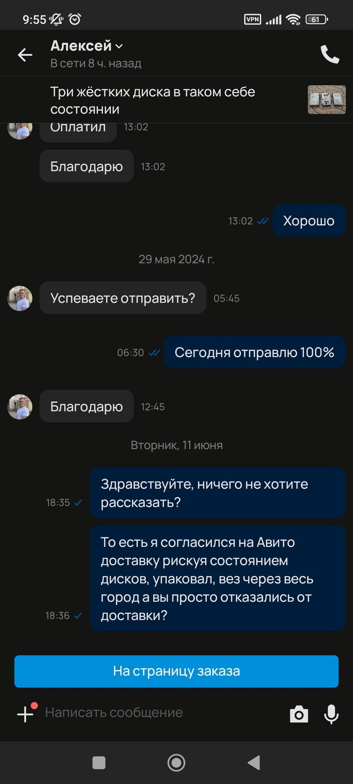 В общем написал такой вежливый Леша (первые 2 фото), способ Авито отправки мы не обговорили и он выбрал самый дешёвый и самый неудобный (далеко отделение) для меня. Так как это уже моя проблема я в дождь поехал отправлять и очень удивился, когда увидел сообщение от Авито что покупатель отказался от товара. Но он не просто отказался, а добавил меня в ЧС для того чтобы видимо не объяснять свое поведение.