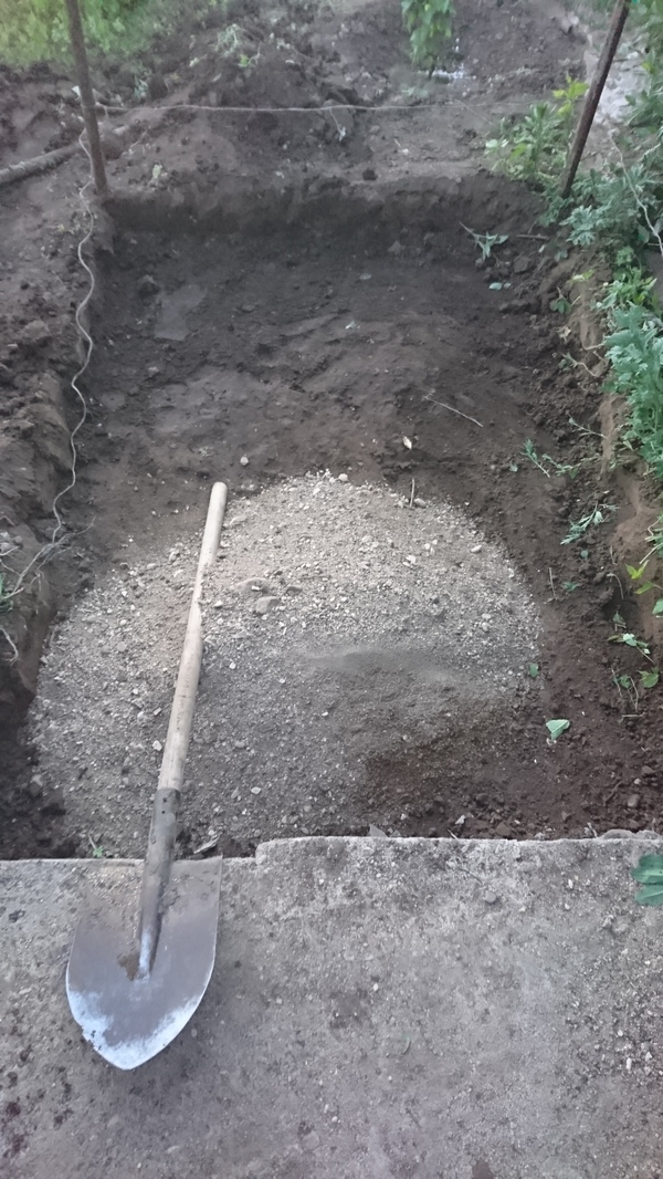Для начала выставил углы и выкопал яму 1,5 на 2,0 м. Грунт песчаный поэтому сильно заглублять не стал (40 см).