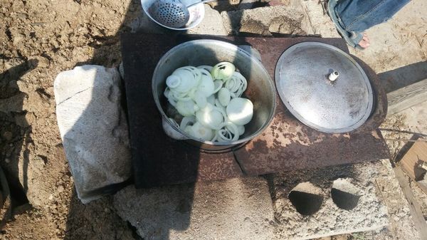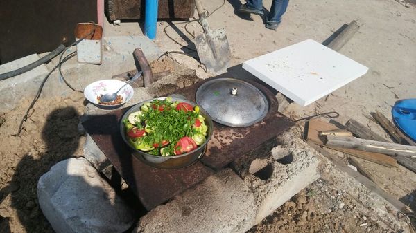 Мысли сразу стали метаться в поисках оптимально-вкусного использования. Ну а максимально вкусная баранина - это баранина в казане. Пришлось срочно сооружать подобие печки, так как полноценный мангал с казаном только в планах. Получилось как то так: