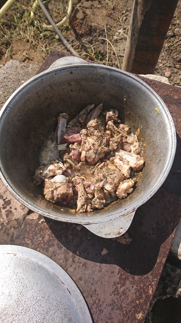Так как жира было немного и сала соответственно выжарилось столько же, а запасы бараньего жира на даче отсутствовали, то просто долил подсолнечного масла в казан и отправил туда мясо: