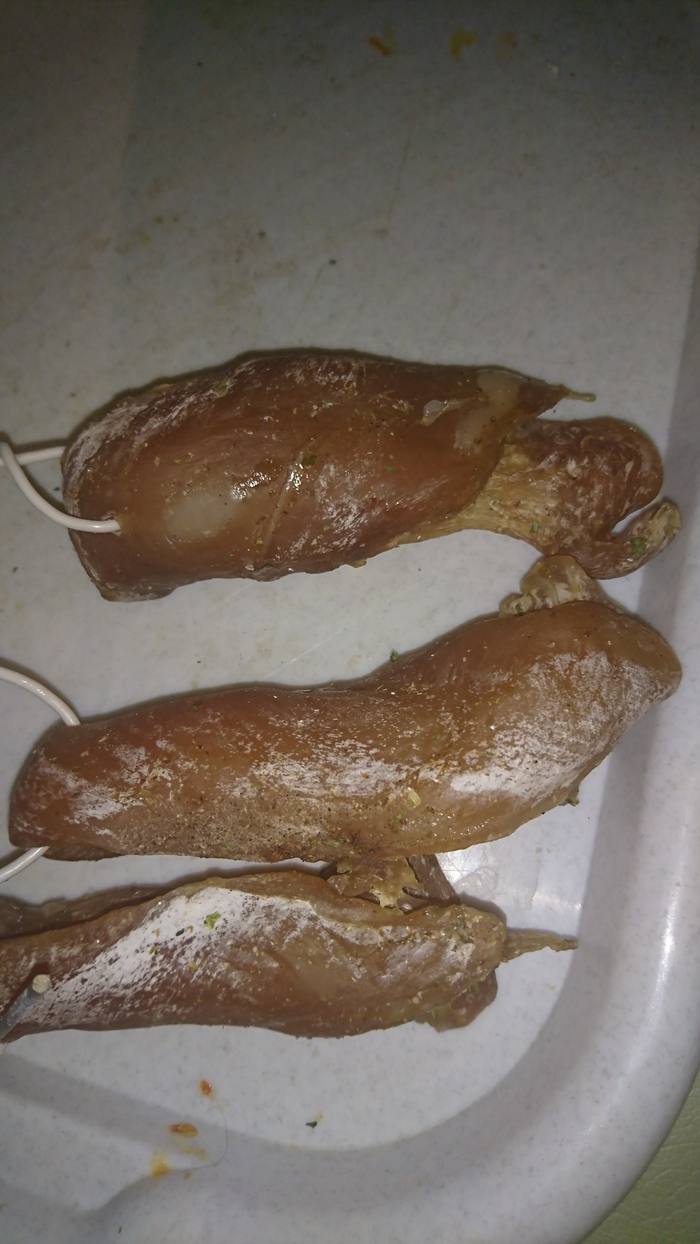 Затем нанизываем на веревку-проволоку и на 3-5 дней (в зависимости от температуры, у меня была под ноль, подержал подольше) на просушку. Можно в холодильник или на балкон. Марлей не обматывал, так как курица вялится быстро, пересохнуть не успело.
