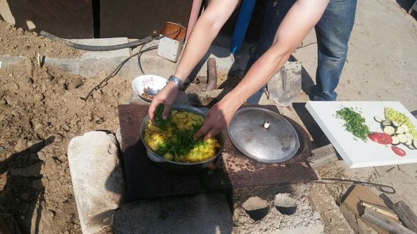 Закрыл казан крышкой, сбил огонь до минимума оставив просто угли, как для шашлыка, и забыл про него на час - полтора, изредко для поддержания углей подкидывая щепки.