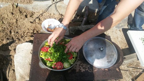 Через положенное время открыл, все это дело перемешал, закинул мелко порезанный чеснок, снял с костра и оставил насыщаться 10 минут.
