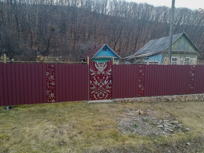 Сетку на габион резал сам, красила жена краской 3в1. Делаем дальше. Просто профлист скучно, решили т.к. своя стройка это свой конструктор с полетом фантазии давай сделаем ковку на навершия. Хорошо. Нарисовал посчитал, чтоб не дорого. Вышло по 400р. На пролет.