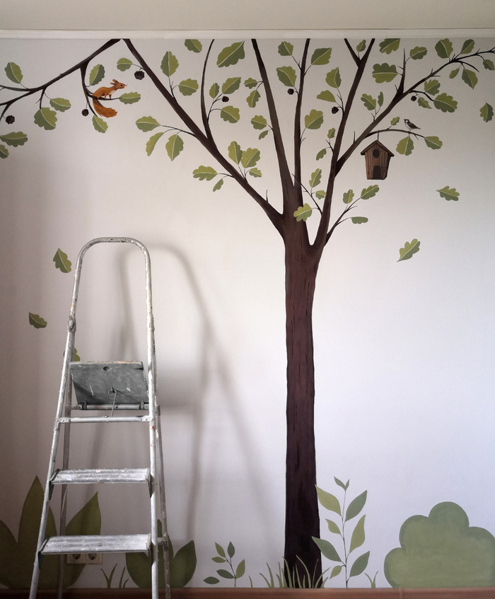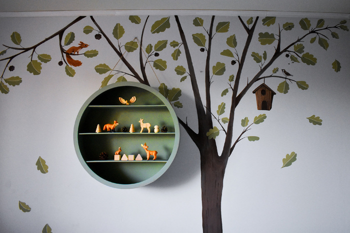 Этот проект изначально был интересен своей необычной задачей. В комнате на стене висела круглая, деревянная полка. И нужно было расписать стену, учитывая в будущем эту деталь интерьера. Вдохновившись этой полкой, я задумала создать целую концепцию, где дерево, как символ жизни и роста, станет центральным элементом.