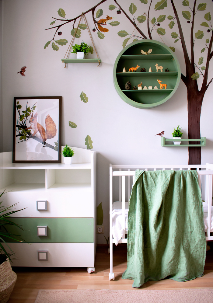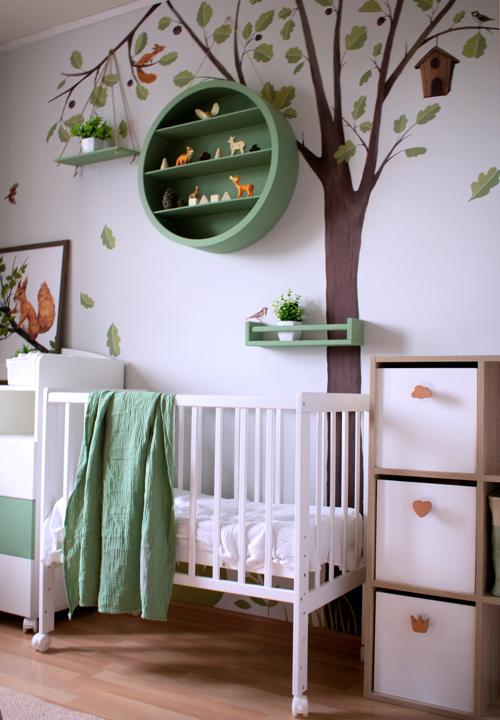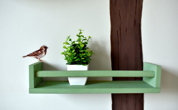 Дополнительная полка, что в будущем украсит пространство над кроваткой, изначально была сделана из дерева. Поэтому было решено перекрасить её в тот же цвет, что и круглую полку, таким образом, создавая гармоничное единство в интерьере.