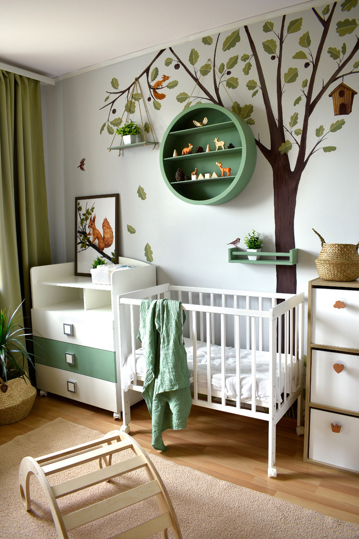 У многих может возникнуть вопрос, причем здесь шишки, дерево же нехвойное. Но мне очень хотелось добавить в эту композицию шишки, и я рада, что мою идею подержали. Дело в том, что в своих проектах мне нравиться добавлять несуществующие вещи. Где, как не в детской можно позволить себе такую смелость.