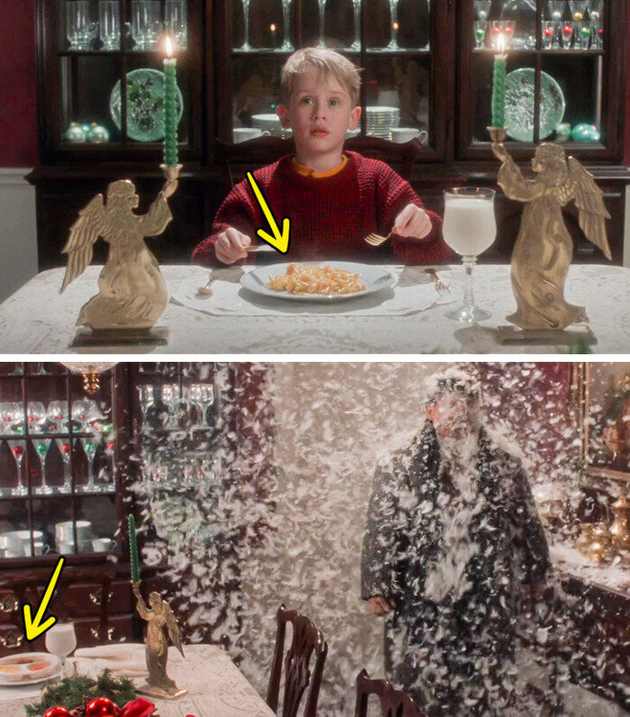 Кевин садится за стол и собирает съесть пасту с сыром. Через минуту в комнате появляется преступник, и паста превращается в другое блюдо.