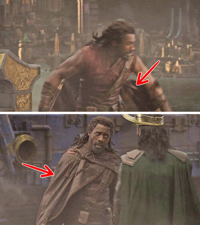 Во время битвы Хеймдалль (актер Идрис Эльба) срывает плащ и бросает с моста. Через несколько минут плащ чудесным образом возвращается.