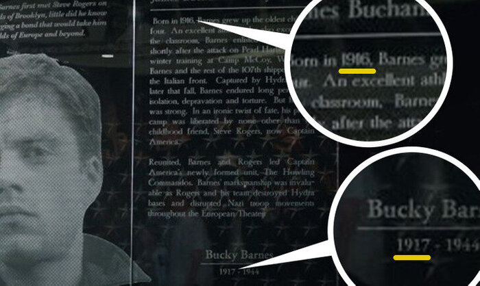 Баки Барнс – лучший друг Стива Роджерса. Вряд ли кто-то обратил внимание на эту ошибку, но от зорких глаз настоящих поклонников Капитана Америка ничего не утаить. Создатели фильма немного напутали и год рождения Баки сначала указан как 1916 год, а затем как 1917 год.