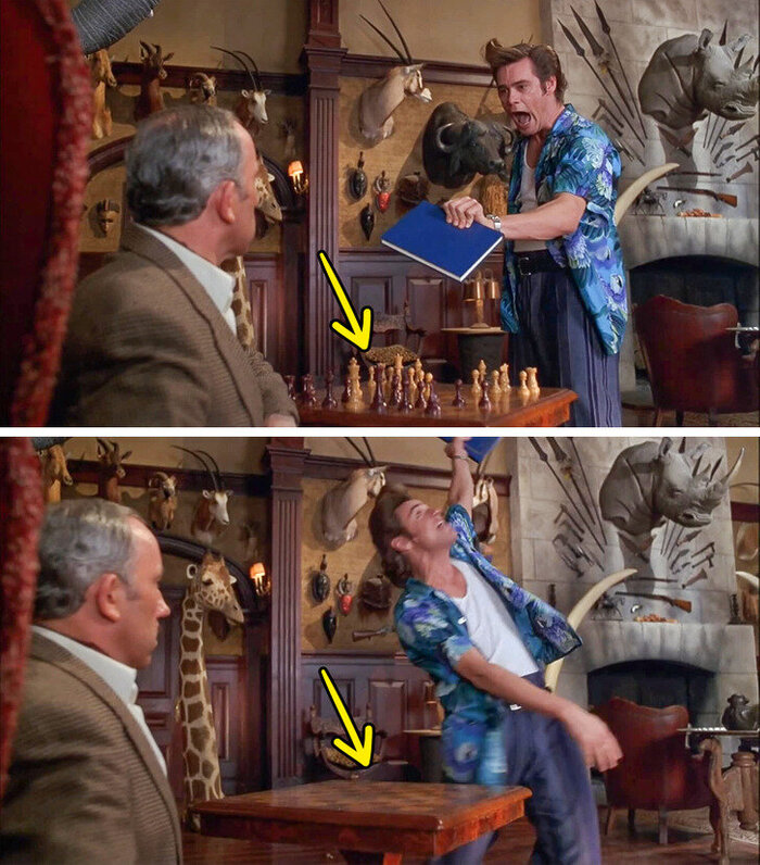 Чудо произошло на шахматном столе во время монолога Эйса Вентуры. Шахматные фигурки то исчезают, то снова появляются.