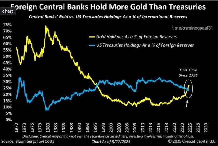 Впервые с 1996 года иностранные центральные банки загрузились золотом, превышающим долю казначейских облигаций США в своих резервах. Доля золота поднялась выше 30%, в то время как доля казначейских облигаций опустилась ниже.