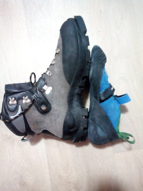 Не путайте альпинизм и скалолазание! Альпинистский ботинок и скальная туфля в сравнении. Оба на мой 45-й размер ноги.