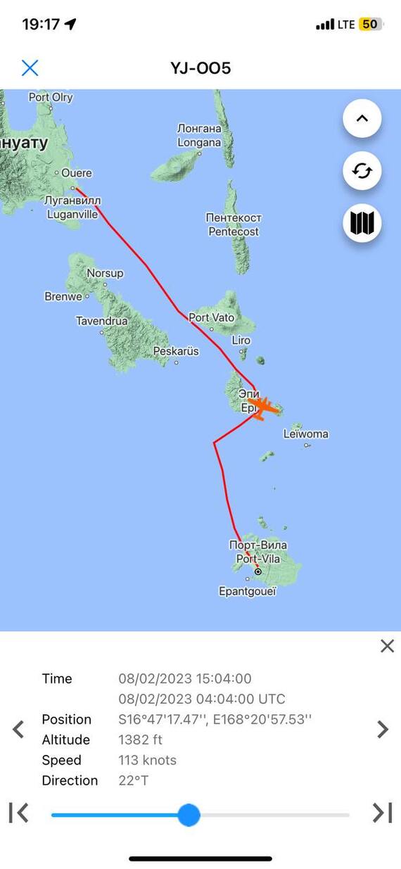 Но в районе вулкана Эпи (кто еще не повесил карту Вануату??) уткнулись в сплошную тёмную стену с интенсивными осадками, так что пришлось выписать загогулину, снизиться с 2300м до 400т и акккуратненько, с 3мя буковками «к», протиснуться между нижней границей облачности и холмиками.