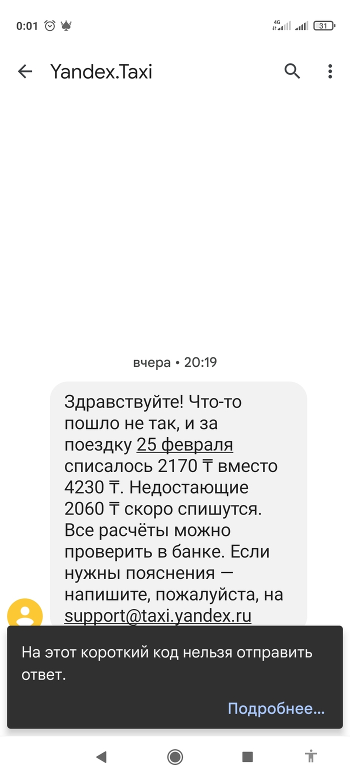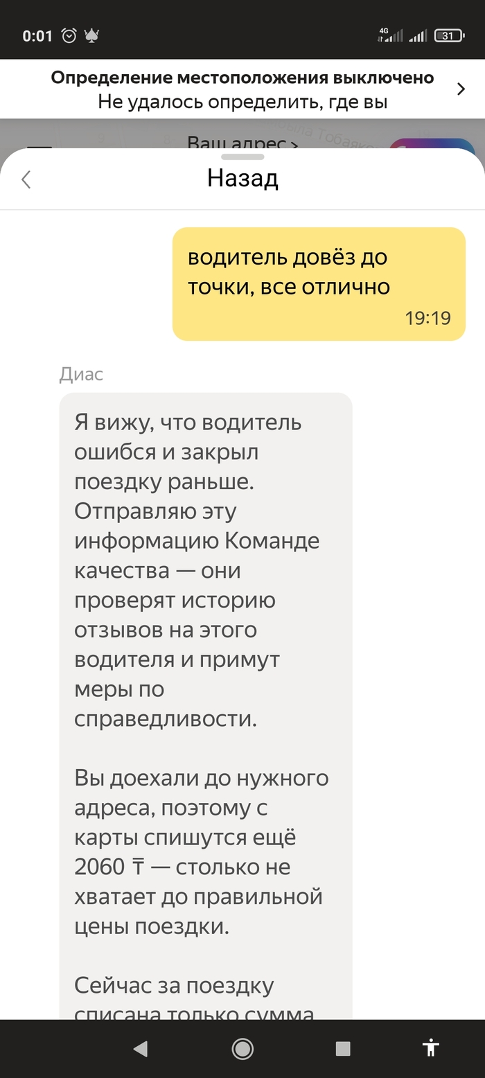 Довозит он нас до первой точки, ну и случайно завершает заказ, соответственно ему приходит заработок по факту завершенной поездки(2170тг). Чел немного расстраивается, но без всяких просьб и выклянчивания доплат везёт меня по второму адресу, по дороге рассказывает что подобный случай уже был и никаких доплат ему не было. Захотелось справедливости, пишу в Яндекс: