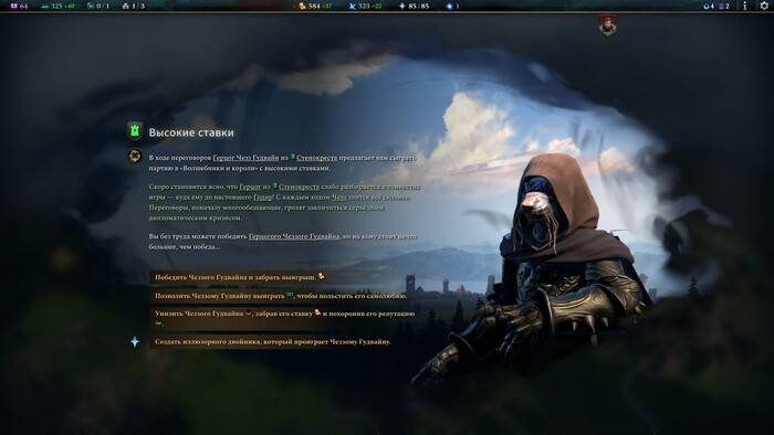 Да, наш правитель может помереть в самый неподходящий момент от передозировки ножей в организме как Гай Юлий Цезарь, но с высокой долей вероятности это будет цепью случайных событий (эвентов) нежели результатом накопившихся интриг. В Crusader Kings подавлять бунты вассалов приходится регулярно, причём некоторым из для восстания вполне хватает повода вида: «вот просто рожа мне твоя не нравится». Old World для подобного слишком «математична». Всё же это игра про строительство домиков, а не про систему сдержек и противовесов политических фракций.