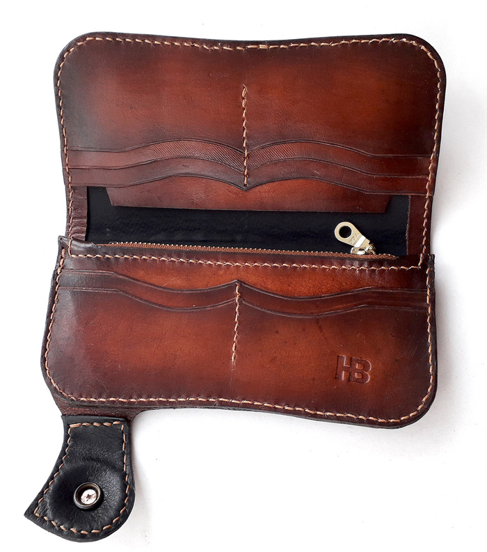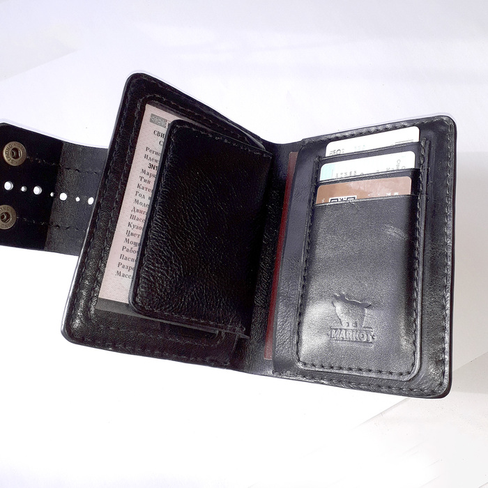 Пошил из обрезков кожи кошелек сыну. Он хотел, что бы "всё влезало". Считаю, что получилось терпимо, хотя и здоровый "кирпич" получился, в штанах не потаскаешь. Так сказать, зимний вариант, в сумке носить. Напоминаю, что я не профи в шитье..