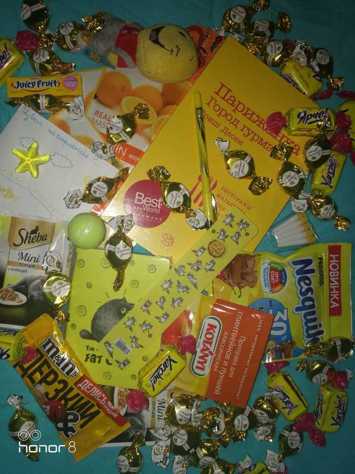 А теперь подробнее о том, что было внутри. Много сладостей, вкусный облепиховый чай, игрушка на ёлку, бомбочка для ванной, деревянный пазл, игрушки для домашних любимцев (за них отдельное спасибо, уже вручены пушистикам), свеча, очень красивый игрушечный котенок (наверное для сына, он сразу сказал МОЁ, но все таки надеюсь что котенок достанется мне😋), книги (я просто обожаю читать, за них особый респект и благодарность) и открытка с тёплыми пожеланиями!