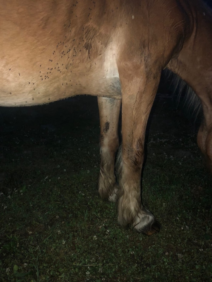 Отчётливо видны раны на ногах, состояние копыт и количество мух на ней.