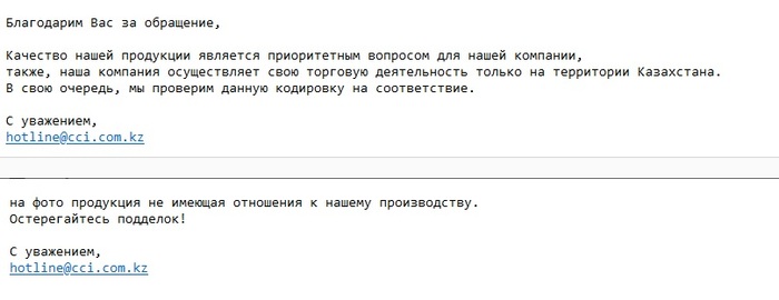 На другой день я вернул эту бутылку в магазин забрав свои кровные и пообщался с товароведом, сказал, что ответил мне завод, про вопиющие ошибки и прочую непотребщину, она показала мне сертификат, в нём якобы всё было тип-топ по названиям и производителю (но я же не спец), и сказала, что попробует разобраться, мол, перезвоните в будни потом. Я ещё походил-посмотрел на эти бутылки - там все такие же с ошибками в тексте и вонючие. Бутылки с другими напитками сильно не проверял. Съездил в такой же другой магазин - там тоже такая же Кока кола, и администратор тоже развёл руками.