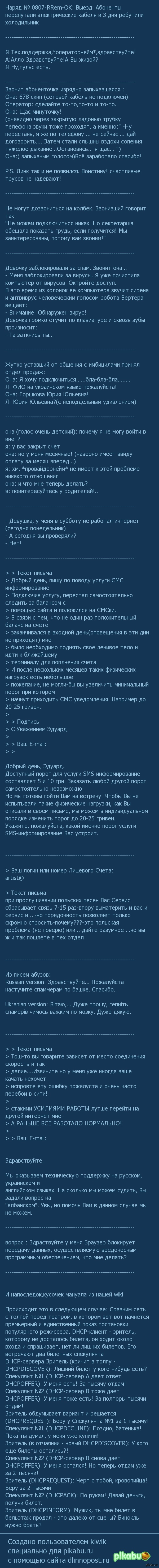 5 kiwik Будни техсапа Южной Пальмиры,или "мы в ответе за тех,кого подключили" 11 лет назад Пунктуация и орфография сохранены.Да и вообще куски тикетов сохранены. P.S.Где мои ошибки,извиняюсь,ночная смена,сами понимаете;) Показать полностью 1 [моё] Длиннопост Пользователи Служба поддержки Ответственность Кого подключили