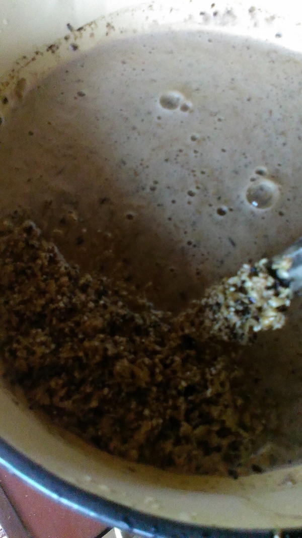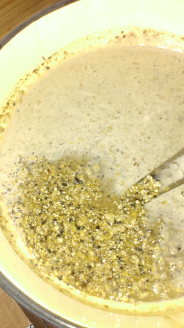 содержимое выливаем в кастрюльку. разводим водой. дрожжи можно поставить на расстойку.