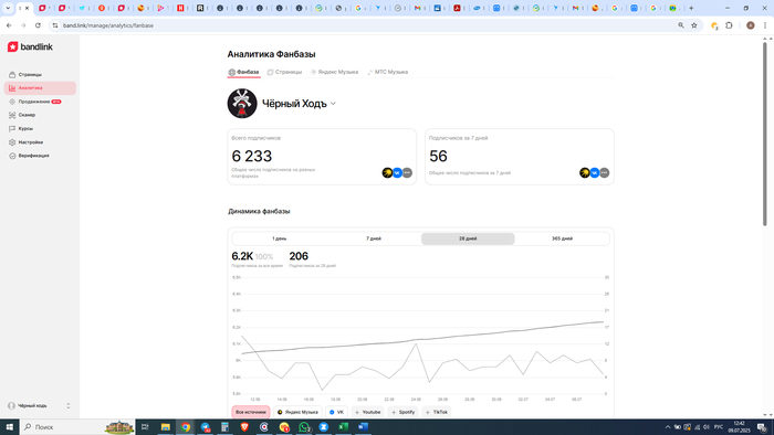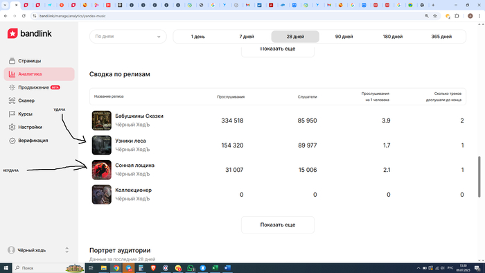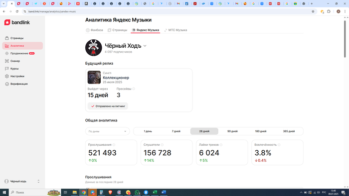 Как это происходит. Когда ваш альбом записан, обложка нарисована, вы направляете все эти файлы представителю дистрибьютора, он вам создаёт страницу музыканта и личный кабинет в bandlink. Bandlink - место, где можно посмотреть аналитику по прослушиваниям, создать ссылки на свою музыку. Выглядит это так. (далее будут скрины с бандлинка)