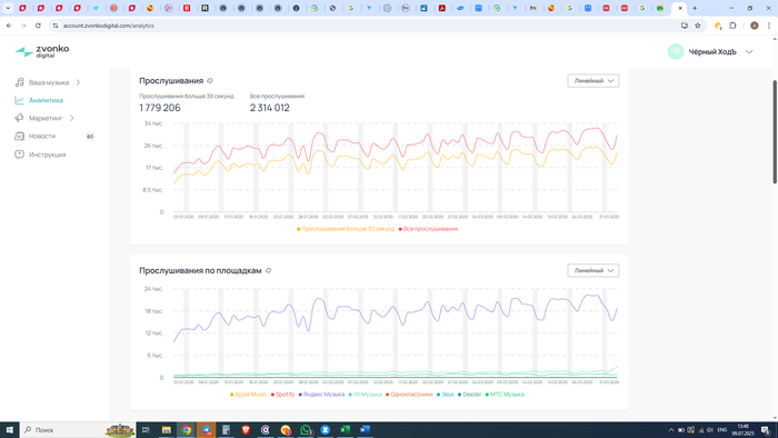 Тут мы можем узнать, что соотношение прослушиваний в Яндексе и ВК - 2/1. Или что люди которые нас слушают состоят на 59% из мужчин от 25-44 и на 18% из девочек того же возраста.