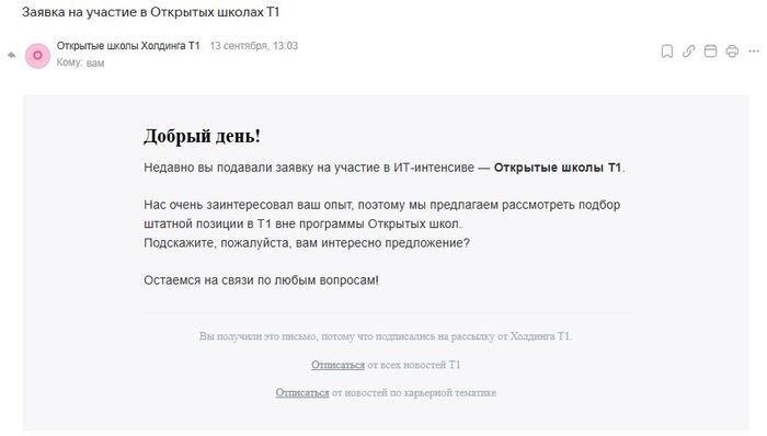 В связи с этим, возникает вопрос: Вы там нормальные вообще? - Это что за методика общения с потенциальным кандидатом? - А может быть, никакого обучения и не существует вообще? - Выбираются соискатели, хорошо решившие тест, и им рассылаются вот такие предложения. Такая вот "Закрытая Открытая школа". Удобненько.