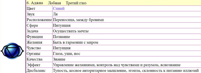 Определяет интуицию, интеллект, сознательный аспект творчества, волевые усилия. Этот центр - глаз сознания, отвечающий за интуицию, или внутреннее знание, когда человек знает, не отдавая себе отчет, откуда он это знает и почему все должно быть именно так. Это центр истины, который позволяет интуитивно прогнозировать исход той или иной ситуации, оставив в стороне эмоции или желания. Здесь накапливается энергия для ясновидения и других экстрасенсорных способностей. Чакра управляет разумом и является своего рода командным пунктом по отношению к другим энергетическим центрам. На эмоциональном уровне чакра повышает уровень осознания повседневной реальности и формирует духовные структуры человека.