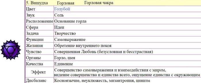 Определяет способность к общению, творческой деятельности и осознанию собственной индивидуальности. Она является центром личности и индивидуальности. Горловая чакра активно показывает человека миру. Она отвечает за общение и все формы творчества - от рукоделия до писательства. В этом центре генерируется все, что связано с авторитетом, обучением, лидерством и организационными способностями, а также голосом, пением и речью.