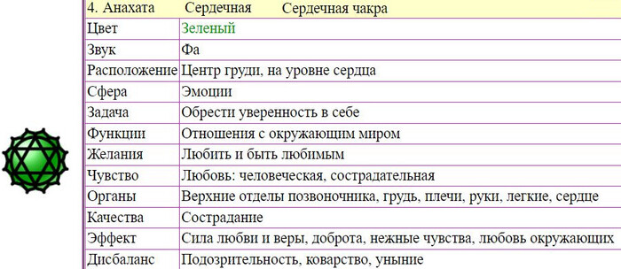 Определяет способность любить, чуткость по отношению к другим людям. Благодаря этому центру человек испытывает любовь к себе и безусловную любовь к другим. Она дает нам возможность ощутить единство со всем живым - людьми, природой, животными, вселенной и Богом. Из этого центра происходят личная сила, целительная сила, уверенность и вера.