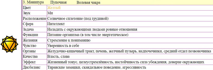 Определяет сердцевину человека, его внутреннее Я, сознание и связь с внутренней силой. Данная чакра отвечает за силу воли и способность сконцентрироваться на достижении определенной цели. В этом центре находятся интеллект и здравое суждение. Благодаря ему человек анализирует и мыслит, генерирует новые идеи и активизирует свою волю. Чакра отвечает за оптимизм и упорство в достижении цели. Она дает человеку чувство собственного достоинства и удовлетворенности собой. Здесь также накапливаются страх и гнев.