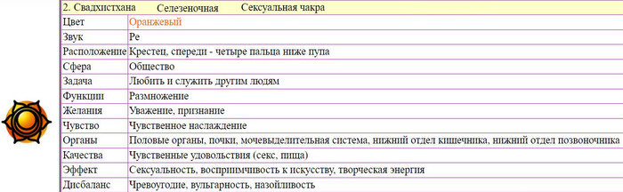 Определяет сексуальную жизнь, удовлетворенность жизнью, способность к самоотдаче. Этот центр чувств отвечает за наши эмоции. Энергия этого центра накапливает информацию о культуре, семейных делах, обо всем, что связано с восприятием себя самого. Данная чакра отвечает за самоуважение человека и за то, как он воспринимает себя по отношению к другим людям. Чакра внушает человеку оптимизм и надежду на эмоциональном уровне и определяет чувство вкуса.