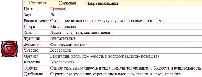 Определяет доверие к миру и внутренние силы. Она отвечает за аспекты жизни, связанные с деньгами, способностью доводить дела до конца, и выживание - заботу о себе, обеспечение пищей, жильем и работой. Это корневой центр, энергия которого позволяет сохранять ясность суждения и способность к концентрации. Чакра обеспечивает жизнестойкость человека и наполняет его энергией, является местом сосредоточения инстинктов, импульсов и жизненной силы.