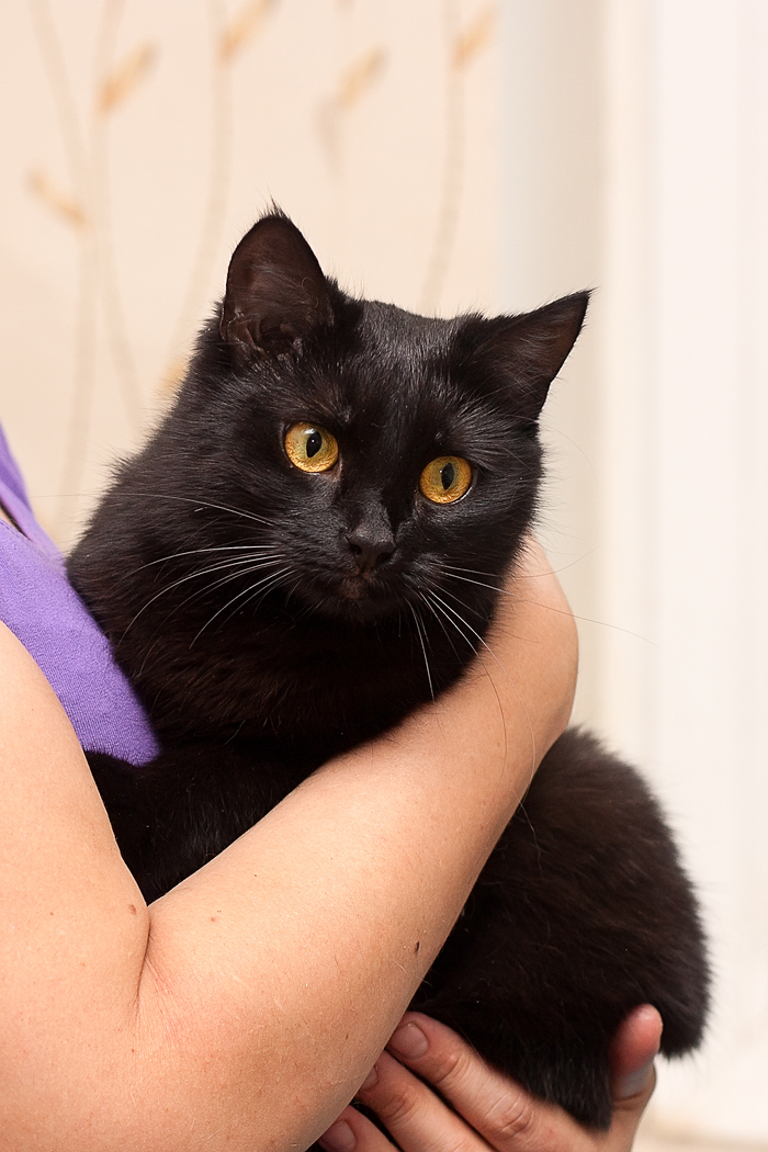 Черные кошки - совершенно особенная категория кошек. Загадочные, неповторимые и прекрасные. Среди всех черных кошек Анфиса выделяется красой и статью. Шерстка яркая, блестящая, волосок к волоску. Глаза большие, выразительные, золотистые и сияющие. Носик черный бархатный. Ушки аккуратные, лапочки изящные и вся Анфиса такая прямо девочка-девочка. Нежная, ласковая, чуточку робкая. Аккуратная и воспитанная, нешумная и беспроблемная кошечка.