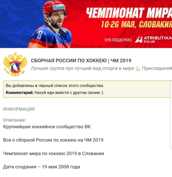 Завершился матч ЧМ по хоккею Россия-Финляндия. Наши програли 0:1. Зашёл я в группу ВК почитать, что пишут болельщики – и увидел взрыв пукана у админа.