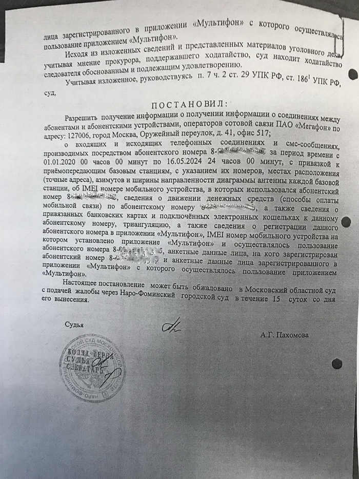 Чтобы найти похищенные деньги пришлось обратиться к следователю с ходатайством о получении сведений телефонных соединений (звонков) между абонентами Мегафона, то есть между потерпевшей и мошенниками. Следователь направил ходатайство в суд, и Наро-Фоминский суд Московской области дал такое разрешение.